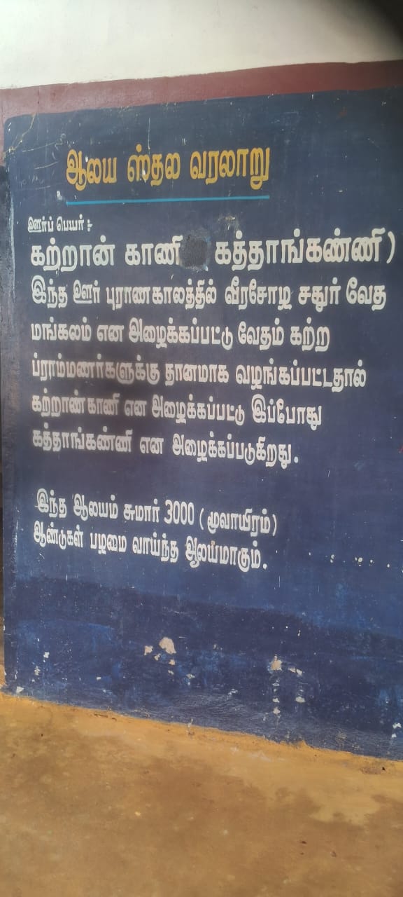 ஆரம்பத்தில் கொங்கு சோழர் காலத்தில் அதாவது கி.பி.12 மற்றும் 13 ஆம் நூற்றாண்டுகளில் வீரசோழசதுர்வேதி மங்கலம் என அழைக்கப்பட்ட இவ்வூர் கி.பி. 14 ஆம் நூற்றாணடில் போசாள மன்னர்கள் காலத்தில் வீரசோழ பிரம்ம தேயமான கற்றாயன் காணியாள வீரசோழ கதுர்வேதி மங்கலம் என வழங்கப்பட்டது. பின்னர், கி.பி 15 ஆம் நூற்றாண்டில் கற்றாயன் காணி என்று அழைக்கப்பட்டது. காலப்போக்கில் தற்போது கத்தாங்கண்ணி என அழைக்கப்பட்டது என்று கல்வெட்டில் உள்ளது மற்றும் இந்த ஆலயம் 3000 ஆண்டுகள் பழமை வாய்ந்த ஆலயமாகும்.