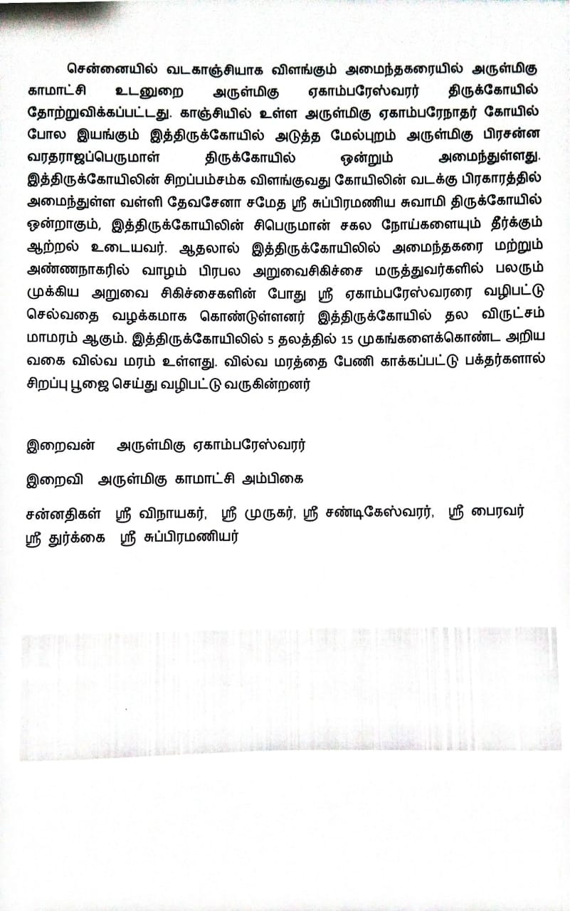 சென்னையில் வடகாஞ்சியாக விளங்கும் அமைந்தகரையில் அருள்மிகு காமாட்சி உடனுறை அருள்மிகு ஏகாம்பரேஸ்வரர் திருக்கோயில் தோற்றுவிக்கப்பட்டது. காஞ்சியில் உள்ள அருள்மிகு ஏகாம்பரேநாதர் கோயில் போல இயங்கும் இத்திருக்கோயில் அடுத்த மேல்புறம் அருள்மிகு பிரசன்ன வரதராஜப்பெருமாள் திருக்கோயில் ஒன்றும் அமைந்துள்ளது. இத்திருக்கோயிலின் சிறப்பம்சம்க விளங்குவது கோயிலின் வடக்கு பிரகாரத்தில் அமைந்துள்ள வள்ளி தேவசேனா சமேத ஸ்ரீ சுப்பிரமணிய சுவாமி திருக்கோயில் ஒன்றாகும், இத்திருக்கோயிலின் சிபெருமான் சகல நோய்களையும் தீர்க்கும் ஆற்றல் உடையவர். ஆதலால் இத்திருக்கோயிலில் அமைந்தகரை மற்றும் அண்ணநாகரில் வாழம் பிரபல அறுவைசிகிச்சை மருத்துவர்களில் பலரும் முக்கிய அறுவை சிகிச்சைகளின் போது ஸ்ரீ ஏகாம்பரேஸ்வரரை வழிபட்டு செல்வதை வழக்கமாக கொண்டுள்ளனர் இத்திருக்கோயில் தல விருட்சம் மாமரம் ஆகும். இத்திருக்கோயிலில் 5 தலத்தில் 15 முகங்களைக்கொண்ட அறிய...சென்னையில் வடகாஞ்சியாக விளங்கும் அமைந்தகரையில் அருள்மிகு காமாட்சி உடனுறை அருள்மிகு ஏகாம்பரேஸ்வரர் திருக்கோயில் தோற்றுவிக்கப்பட்டது. காஞ்சியில் உள்ள அருள்மிகு ஏகாம்பரேநாதர் கோயில் போல இயங்கும் இத்திருக்கோயில் அடுத்த மேல்புறம் அருள்மிகு பிரசன்ன வரதராஜப்பெருமாள் திருக்கோயில் ஒன்றும் அமைந்துள்ளது. இத்திருக்கோயிலின் சிறப்பம்சம்க விளங்குவது கோயிலின் வடக்கு பிரகாரத்தில் அமைந்துள்ள வள்ளி தேவசேனா சமேத ஸ்ரீ சுப்பிரமணிய சுவாமி திருக்கோயில் ஒன்றாகும், இத்திருக்கோயிலின் சிபெருமான் சகல நோய்களையும் தீர்க்கும் ஆற்றல் உடையவர். ஆதலால் இத்திருக்கோயிலில் அமைந்தகரை மற்றும் அண்ணநாகரில் வாழம் பிரபல அறுவைசிகிச்சை மருத்துவர்களில் பலரும் முக்கிய அறுவை சிகிச்சைகளின் போது ஸ்ரீ ஏகாம்பரேஸ்வரரை வழிபட்டு செல்வதை வழக்கமாக கொண்டுள்ளனர் இத்திருக்கோயில் தல விருட்சம் மாமரம் ஆகும். இத்திருக்கோயிலில் 5 தலத்தில் 15 முகங்களைக்கொண்ட அறிய வகை வில்வ மரம் உள்ளது. வில்வ மரத்தை பேணி காக்கப்பட்டு பக்தர்களால் சிறப்பு பூஜை செய்து வழிபட்டு வருகின்றனர்