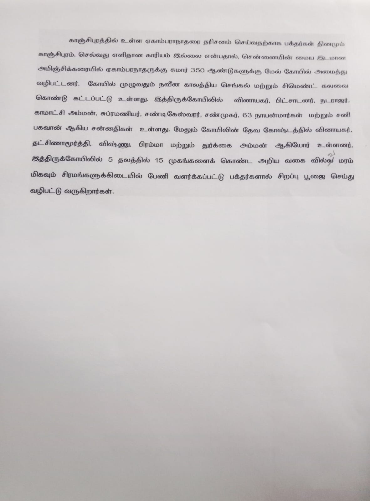 சென்னையில் வடகாஞ்சியாக விளங்கும் அமைந்தகரையில் அருள்மிகு காமாட்சி உடனுறை அருள்மிகு ஏகாம்பரேஸ்வரர் திருக்கோயில் தோற்றுவிக்கப்பட்டது. காஞ்சியில் உள்ள அருள்மிகு ஏகாம்பரேநாதர் கோயில் போல இயங்கும் இத்திருக்கோயில் அடுத்த மேல்புறம் அருள்மிகு பிரசன்ன வரதராஜப்பெருமாள் திருக்கோயில் ஒன்றும் அமைந்துள்ளது. இத்திருக்கோயிலின் சிறப்பம்சம்க விளங்குவது கோயிலின் வடக்கு பிரகாரத்தில் அமைந்துள்ள வள்ளி தேவசேனா சமேத ஸ்ரீ சுப்பிரமணிய சுவாமி திருக்கோயில் ஒன்றாகும், இத்திருக்கோயிலின் சிபெருமான் சகல நோய்களையும் தீர்க்கும் ஆற்றல் உடையவர். ஆதலால் இத்திருக்கோயிலில் அமைந்தகரை மற்றும் அண்ணநாகரில் வாழம் பிரபல அறுவைசிகிச்சை மருத்துவர்களில் பலரும் முக்கிய அறுவை சிகிச்சைகளின் போது ஸ்ரீ ஏகாம்பரேஸ்வரரை வழிபட்டு செல்வதை வழக்கமாக கொண்டுள்ளனர் இத்திருக்கோயில் தல விருட்சம் மாமரம் ஆகும். இத்திருக்கோயிலில் 5 தலத்தில் 15 முகங்களைக்கொண்ட...சென்னையில் வடகாஞ்சியாக விளங்கும் அமைந்தகரையில் அருள்மிகு காமாட்சி உடனுறை அருள்மிகு ஏகாம்பரேஸ்வரர் திருக்கோயில் தோற்றுவிக்கப்பட்டது. காஞ்சியில் உள்ள அருள்மிகு ஏகாம்பரேநாதர் கோயில் போல இயங்கும் இத்திருக்கோயில் அடுத்த மேல்புறம் அருள்மிகு பிரசன்ன வரதராஜப்பெருமாள் திருக்கோயில் ஒன்றும் அமைந்துள்ளது. இத்திருக்கோயிலின் சிறப்பம்சம்க விளங்குவது கோயிலின் வடக்கு பிரகாரத்தில் அமைந்துள்ள வள்ளி தேவசேனா சமேத ஸ்ரீ சுப்பிரமணிய சுவாமி திருக்கோயில் ஒன்றாகும், இத்திருக்கோயிலின் சிபெருமான் சகல நோய்களையும் தீர்க்கும் ஆற்றல் உடையவர். ஆதலால் இத்திருக்கோயிலில் அமைந்தகரை மற்றும் அண்ணநாகரில் வாழம் பிரபல அறுவைசிகிச்சை மருத்துவர்களில் பலரும் முக்கிய அறுவை சிகிச்சைகளின் போது ஸ்ரீ ஏகாம்பரேஸ்வரரை வழிபட்டு செல்வதை வழக்கமாக கொண்டுள்ளனர் இத்திருக்கோயில் தல விருட்சம் மாமரம் ஆகும். இத்திருக்கோயிலில் 5 தலத்தில் 15 முகங்களைக்கொண்ட அறிய வகை வில்வ மரம் உள்ளது. வில்வ மரத்தை பேணி காக்கப்பட்டு பக்தர்களால் சிறப்பு பூஜை செய்து வழிபட்டு வருகின்றனர்