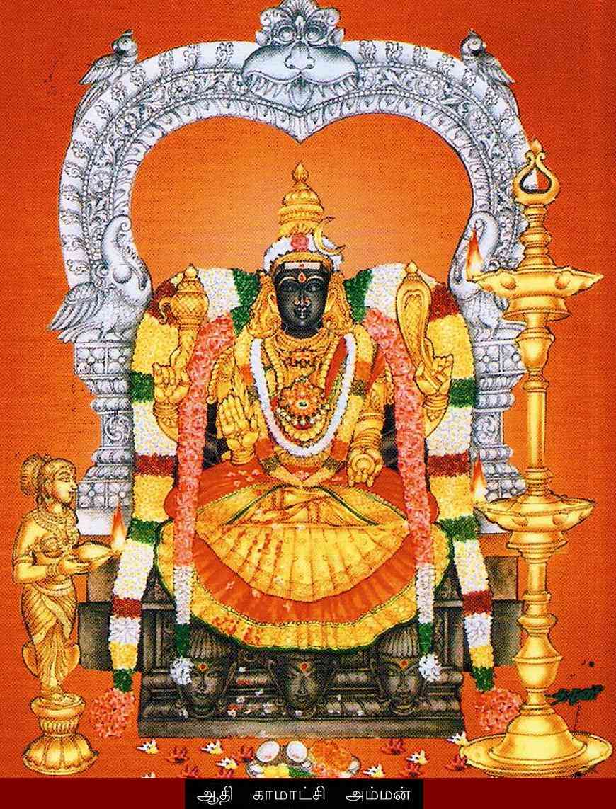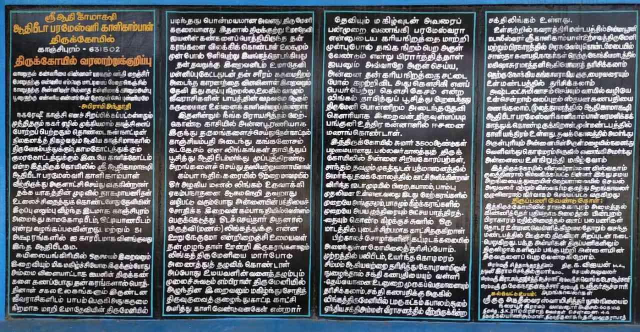 ஆதிகாமாட்சியின் தோற்றம் (ம) இத்திருக்கோயிலின் வரலாறு குறித்து கல்வெட்டில் விரிவாக கூறப்பட்டுள்ளது.கயிலாயத்தில் சிவபெருமானின் இருகண்களை பார்வதி தன்னுடைய கரங்களினால் பொத்தியதால்,பூலோகம் இருண்டு பாவம் பெருகி கருமை நிறமாக மாறி அன்னையின் திருமேனியில் படிந்தது.இதனால் உலக இயக்கமே நின்று போய்விட்டது.இதனால் ஏற்பட்ட பாவத்திற்கு பரிகாரமாக,அன்னை பார்வதி பூமியில் காசியில் அவதரித்து விட விருட்சத்தின் கீழ் இருந்து பூஜை செய்து அன்னபூரணியாய் தோன்றி அன்னதானம் செய்து வந்தாள்.பல்வேறு தானதர்மங்கள் செய்தும் ஈசனை அடையமுடியாதலால் மனம் சோர்ந்து காஞ்சித்தலத்திற்கு சென்று மணலை லிங்கமாக வைத்து பூஜை செய்தால் கயிலாயம் அடையலாம் என அறிந்து தேவி இங்கு ஆதியில் வந்து தங்கியதால் ஆதிகாமாட்சி எனவும்,காபாலிகள் பூசை செய்து பலி கொடுத்ததால் காளி எனவும்,ஆதிசங்கரர் அம்மனுடைய உக்கிரத்தை தனித்ததாலும் ஆதிபீடாபரமேசுவரி...ஆதிகாமாட்சியின் தோற்றம் (ம) இத்திருக்கோயிலின் வரலாறு குறித்து கல்வெட்டில் விரிவாக கூறப்பட்டுள்ளது.கயிலாயத்தில் சிவபெருமானின் இருகண்களை பார்வதி தன்னுடைய கரங்களினால் பொத்தியதால்,பூலோகம் இருண்டு பாவம் பெருகி கருமை நிறமாக மாறி அன்னையின் திருமேனியில் படிந்தது.இதனால் உலக இயக்கமே நின்று போய்விட்டது.இதனால் ஏற்பட்ட பாவத்திற்கு பரிகாரமாக,அன்னை பார்வதி பூமியில் காசியில் அவதரித்து விட விருட்சத்தின் கீழ் இருந்து பூஜை செய்து அன்னபூரணியாய் தோன்றி அன்னதானம் செய்து வந்தாள்.பல்வேறு தானதர்மங்கள் செய்தும் ஈசனை அடையமுடியாதலால் மனம் சோர்ந்து காஞ்சித்தலத்திற்கு சென்று மணலை லிங்கமாக வைத்து பூஜை செய்தால் கயிலாயம் அடையலாம் என அறிந்து தேவி இங்கு ஆதியில் வந்து தங்கியதால் ஆதிகாமாட்சி எனவும்,காபாலிகள் பூசை செய்து பலி கொடுத்ததால் காளி எனவும்,ஆதிசங்கரர் அம்மனுடைய உக்கிரத்தை தனித்ததாலும் ஆதிபீடாபரமேசுவரி எனவும் பெயர்கள் வழங்கப்பட்டு வருகின்றது.
