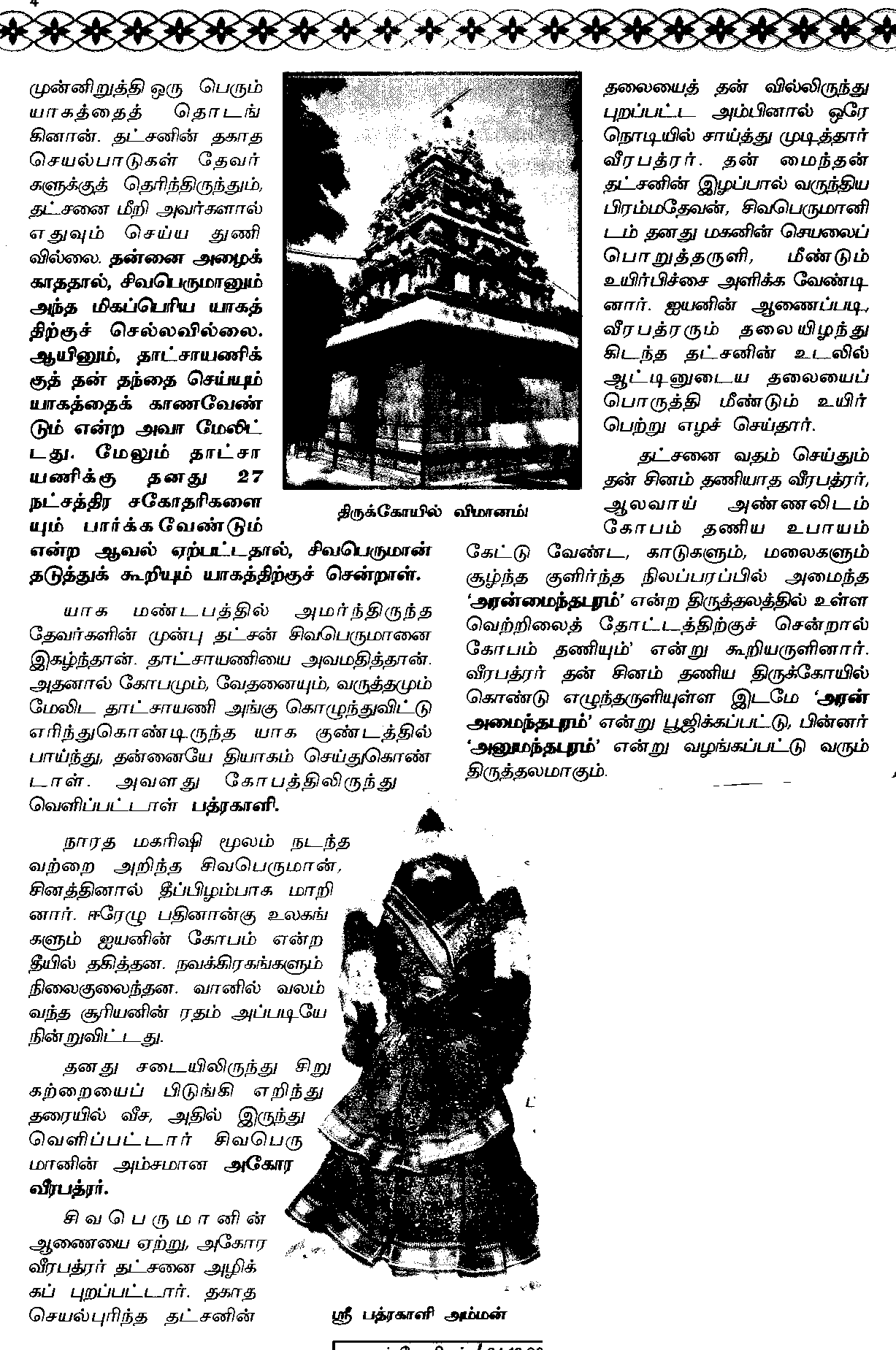 விரித்த சடையுடன் நாகங்களை மாலையாக அணிந்துகொண்டு, மயானத்தில் திரியும் மகாதேவனுக்கா நான் பெண்ணை கொடுப்பேன்? என்று பலரிடமும் திருக்கயிலை பெருமானைப் பற்றி ஏளனமாகக் கூறிவந்தான் தட்சன். தன் பெண்ணிற்கு ஏற்ற மாப்பிளையைத் தேர்ந்தெடுப்பதற்காக சுயம்வரம் ஒன்றையும் ஏற்பாடு செய்தான்.சுயம்வரத்திற்கு இந்திராதி தேவர்கள்,கந்தவர்கள் வித்யாதர்கள் என அனைத்து தேவர்களும் தாட்சாயணியின்...பிரம்மதேவனின் மனஸ புத்திரர்களுள் ஒருவன் தட்சன். பிறைசூடிய பெருமானின் மீது தீவிர பக்தி கொண்ட தட்சன், நான்முகனின் கட்டை விரலில் அவதரித்தவன் என்றும் புராணங்கள் கூறுகின்றன, தட்சனின் பெண் தாட்சாயணி.அழகிலும், நற்குணங்களிலும் ஈடிணையற்றவள். சிவபெருமாள் மீது அளவற்ற பக்தி கொண்டவள்.விவாக வயதை அடைந்த தன் பெண்ணின் அழகையும் அரண்மனையில் வசதிகளுடன் வாழ்ந்ததையும் கருதி, தாட்சாயணியை சிவபெருமானுக்குத் திருமணம் செய்து கொடுக்க தட்சனுக்கு விருப்பமில்லை.