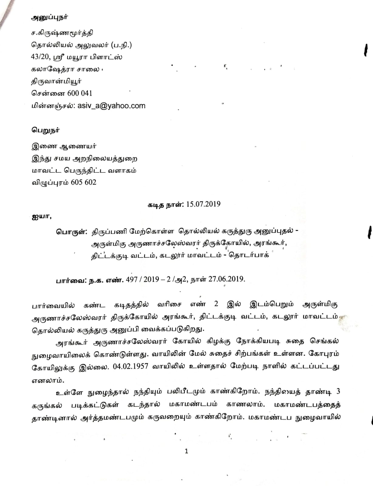 அரங்கூர், அருள்மிகு அருணாச்சலேஸ்வரர் திருக்கோயில் கிழக்கு நோக்கியபடி சுதை செங்கல் நுழைவாயிலைக் கொண்டுள்ளது. உள்ளே நுழைந்தால் நந்தி பகவான், மகாமண்டபம், அர்த்த மண்டபம், கருவறை காணப்படுகிறது. மகாமண்டபம், அர்த்த மண்டபம், கருவறையின் கீழ்பாகம் அதாவது அதிட்டானம், சுவர், பித்தி எனப்படும் கொடுங்கை ஆகியவை கருங்கல்லால் ஆனது. கருவறை கொடுங்கையில் யாளி வரிசை உள்ளது. கருவறை தென்புறம் கோஷ்டத்தில் தட்சிணாமூர்த்தி சிற்பமாக உள்ளது. தூண் ஒன்றில் வழிபடும் ஆடவர் உருவம் உள்ளது.