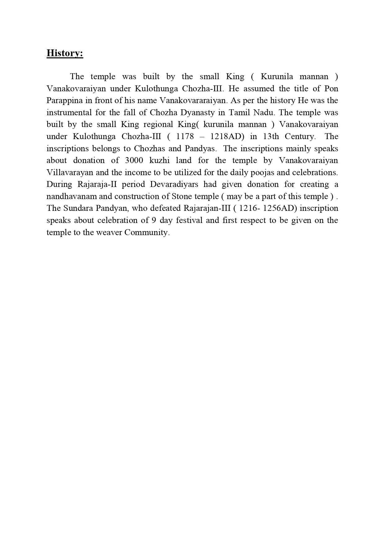 இந்தக் கோயில் மூன்றாம் குலோத்துங்க சோழனின் கீழ் சிறிய மன்னன் (குருநில மன்னன்) வானகோவரையனால் கட்டப்பட்டது. அவர் தனது பெயருக்கு முன்னால் வானகோவரையான் என்ற பட்டத்தை ஏற்றுக்கொண்டார். வரலாற்றின் படி, தமிழ்நாட்டில் சோழ வம்சத்தின் வீழ்ச்சிக்கு அவர் முக்கியக் காரணமாக இருந்தார். இந்தக் கோயில் 13 ஆம் நூற்றாண்டில் குலோத்துங்க சோழன்- (கி.பி 1178 - 1218) கீழ் சிறிய மன்னன் பிராந்திய மன்னன் (குருநில மன்னன்) வானகோவரையனால் கட்டப்பட்டது. இந்தக் கல்வெட்டுகள் சோழர்கள் மற்றும் பாண்டியர்களுக்குச் சொந்தமானவை. இந்தக் கல்வெட்டுகள் முக்கியமாக வானகோவரையன் வில்லவராயன் கோயிலுக்கு 3000 குழி நிலத்தை நன்கொடையாக வழங்கியதையும், அதன் மூலம் கிடைக்கும் வருமானம் தினசரி பூஜைகள் மற்றும் கொண்டாட்டங்களுக்குப் பயன்படுத்தப்படுவதையும் பற்றிப் பேசுகின்றன. இரண்டாம் ராஜராஜன்...இந்தக் கோயில் மூன்றாம் குலோத்துங்க சோழனின் கீழ் சிறிய மன்னன் (குருநில மன்னன்) வானகோவரையனால் கட்டப்பட்டது. அவர் தனது பெயருக்கு முன்னால் வானகோவரையான் என்ற பட்டத்தை ஏற்றுக்கொண்டார். வரலாற்றின் படி, தமிழ்நாட்டில் சோழ வம்சத்தின் வீழ்ச்சிக்கு அவர் முக்கியக் காரணமாக இருந்தார். இந்தக் கோயில் 13 ஆம் நூற்றாண்டில் குலோத்துங்க சோழன்- (கி.பி 1178 - 1218) கீழ் சிறிய மன்னன் பிராந்திய மன்னன் (குருநில மன்னன்) வானகோவரையனால் கட்டப்பட்டது. இந்தக் கல்வெட்டுகள் சோழர்கள் மற்றும் பாண்டியர்களுக்குச் சொந்தமானவை. இந்தக் கல்வெட்டுகள் முக்கியமாக வானகோவரையன் வில்லவராயன் கோயிலுக்கு 3000 குழி நிலத்தை நன்கொடையாக வழங்கியதையும், அதன் மூலம் கிடைக்கும் வருமானம் தினசரி பூஜைகள் மற்றும் கொண்டாட்டங்களுக்குப் பயன்படுத்தப்படுவதையும் பற்றிப் பேசுகின்றன. இரண்டாம் ராஜராஜன் காலத்தில் தேவரடியார்கள் நந்தவனம் கட்டுவதற்கும், கல் கோயில் கட்டுவதற்கும் நன்கொடை அளித்தனர் (இது இந்தக் கோயிலின் ஒரு பகுதியாக இருக்கலாம்). மூன்றாம் ராஜராஜனை (கி.பி. 1216-1256) தோற்கடித்த சுந்தர பாண்டியன் கல்வெட்டு, 9 நாள் திருவிழா கொண்டாடுவது மற்றும் நெசவாளர் சமூகத்திற்கு கோவிலில் வழங்கப்படும் முதல் மரியாதை பற்றி பேசுகிறது.