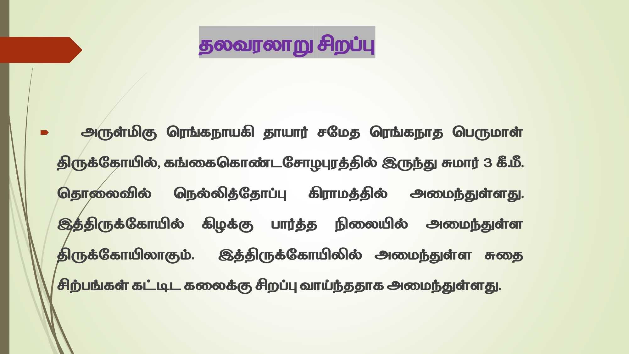 அருள்மிகு ரெங்கநாயகி தாயார் சமேத ரெங்கநாத பெருமாள் திருக்கோயில், கங்கைகொண்டசோழபுரத்தில் இருந்து சுமார் 3 கீ.மீ. தொலைவில் நெல்லித்தோப்பு கிராமத்தில் அமைந்துள்ளது. இத்திருக்கோயில் கிழக்கு பார்த்த நிலையில் அமைந்துள்ள திருக்கோயிலாகும். இத்திருக்கோயிலில் அமைந்துள்ள சுதை சிற்பங்கள் கட்டிட கலைக்கு சிறப்பு வாய்ந்ததாக அமைந்துள்ளது.