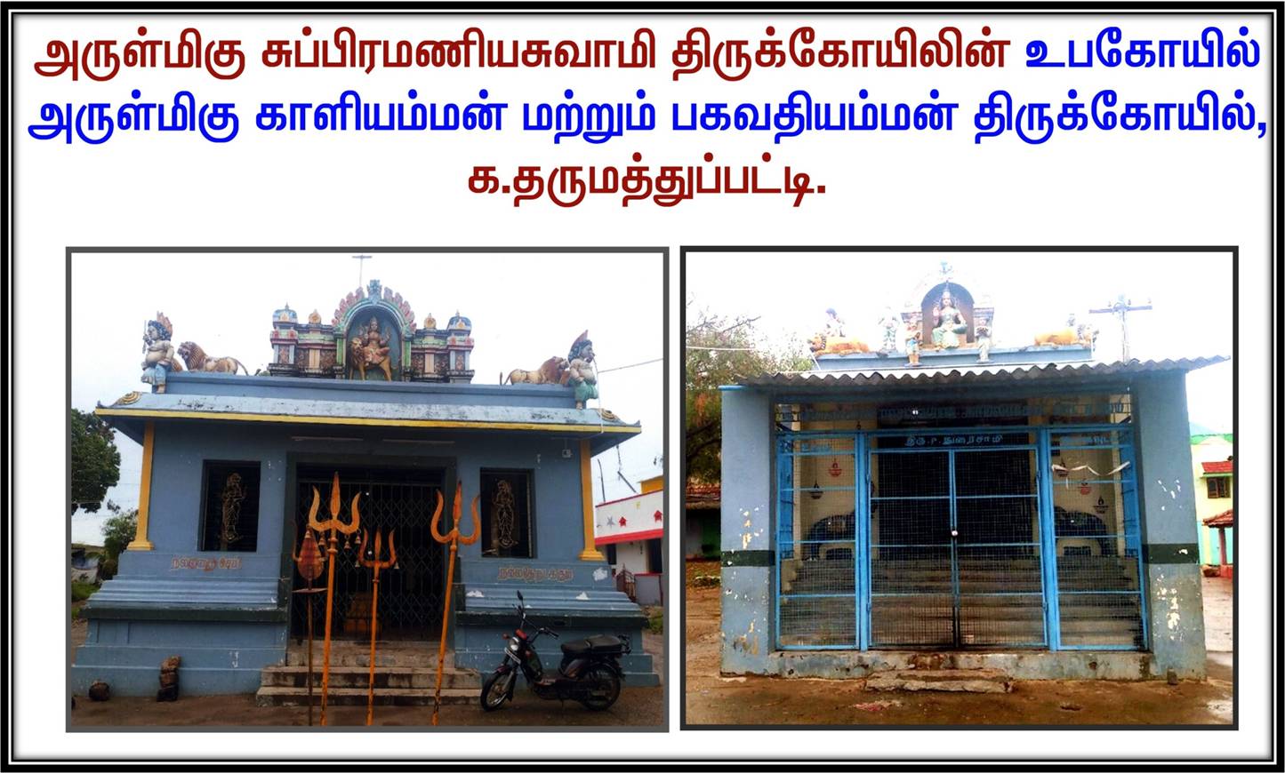 அருள்மிகு காளியம்மன் பகவதியம்மன் இத்திருக்கோவில் தருமத்துப்பட்டி .அருள்மிகு சுப்ரமணியசுவாமி திருக்கோவிலின் உபகோவிலாகும். இத்திருக்கோவில் 50 ஆண்டுக்குள் கட்டப்பட்டது. காளியம்மன் , பகவதியம்மன் அருள்புரிகிறார்கள். கண்காணிப்பு கேமரா உள்ளது. செம்பட்டி வழி பழநி ரோட்டில் அமைந்துள்ளது . .அருள்மிகு காளியம்மன் பகவதியம்மன் இத்திருக்கோவில் தருமத்துப்பட்டி .அருள்மிகு சுப்ரமணியசுவாமி திருக்கோவிலின் உபகோவிலாகும். இத்திருக்கோவில் 50 ஆண்டுக்குள் கட்டப்பட்டது. காளியம்மன் , பகவதியம்மன் அருள்புரிகிறார்கள். கண்காணிப்பு கேமரா உள்ளது. செம்பட்டி வழி பழநி ரோட்டில் அமைந்துள்ளது . .