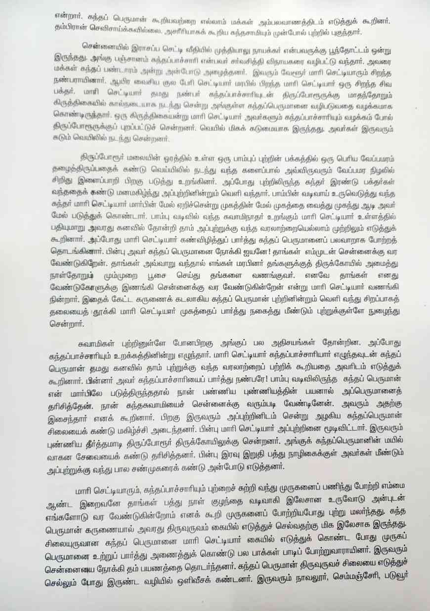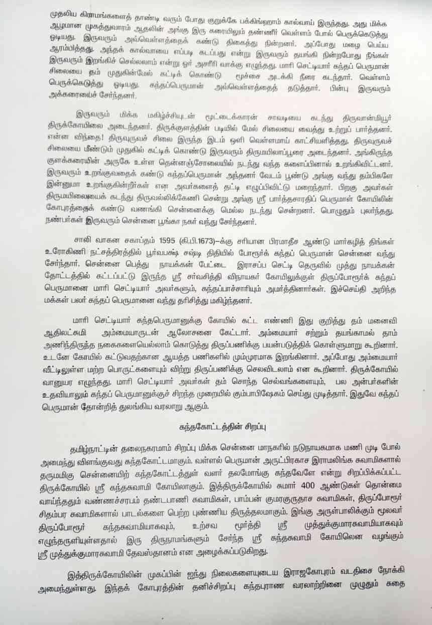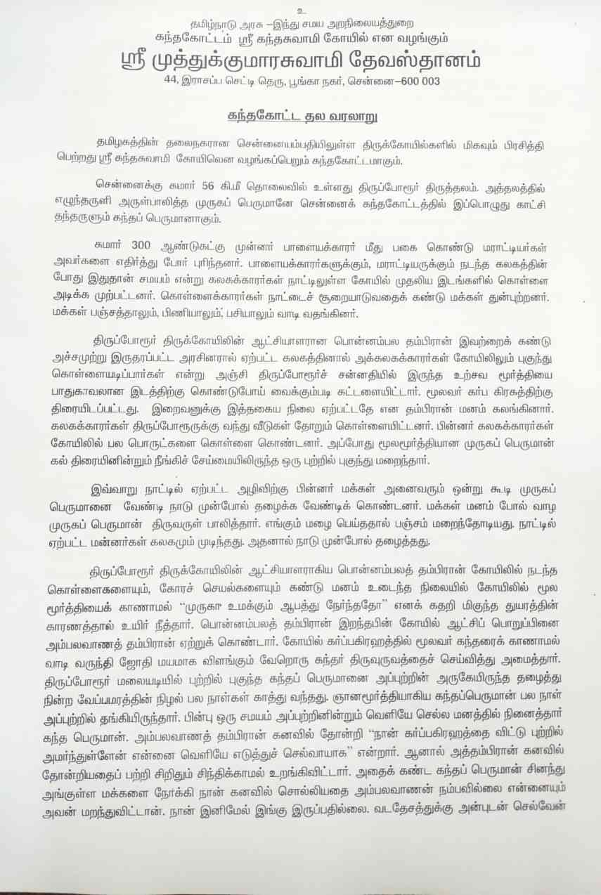 தமிழகத்தின் தலைநகரான சென்னையம்பதியிலுள்ள திக்கோயில்களில் மிகவும் பிரசித்தி பெற்றது ஸ்ரீ கந்தஸ்வாமி கோயிலென வழங்கபெறும் கந்தகோட்டமாகும்.சென்னைக்கு சுமார் கிலோமீட்டர் தொலைவில் உள்ளது திருப்போரூர் திருத்தலம். அத்தலத்தில் எழுந்தருளி அருள்பாலித்த முருகப் பெருமானே சென்னைக் கந்தகோட்டத்தில் இப்பொழுது காட்சி தந்தருளும் கந்தப்பெருமானாகும். சுமார் ஆண்டுகளுக்கு முன்னர் பாளையக்காரர் மீது பகை கொண்டு மராட்டியர்கள் அவர்களை எதிர்த்து போர் புரிந்தனர். பாளையக்காரர்களும் மராட்டியருக்கும் நடந்த கலகத்தின் போது இதுதான் சமயம் என்று கலகக்காரர்கள் நாட்டிலுள்ள கோயில் முதலிய இடங்களில் கொள்ளை அடிக்க முற்பட்டனர். கொள்ளைக்காரர்கள் நாட்டை சூறையாடுவதை கண்டு மக்கள் துன்புற்றனர். மக்கள் பஞ்சத்தாலும் பிணியாலும் பசியாலும் வாடி வதங்கினர்.திருப்போரூர் திருக்கோயிலின் ஆட்சியாளரான பொன்னம்பல தம்பிரான் இவற்றை கண்டு அச்சமுற்று இருதரப்பட்ட அரசினரால்...தமிழகத்தின் தலைநகரான சென்னையம்பதியிலுள்ள திக்கோயில்களில் மிகவும் பிரசித்தி பெற்றது ஸ்ரீ கந்தஸ்வாமி கோயிலென வழங்கபெறும் கந்தகோட்டமாகும்.சென்னைக்கு சுமார் கிலோமீட்டர் தொலைவில் உள்ளது திருப்போரூர் திருத்தலம். அத்தலத்தில் எழுந்தருளி அருள்பாலித்த முருகப் பெருமானே சென்னைக் கந்தகோட்டத்தில் இப்பொழுது காட்சி தந்தருளும் கந்தப்பெருமானாகும். சுமார் ஆண்டுகளுக்கு முன்னர் பாளையக்காரர் மீது பகை கொண்டு மராட்டியர்கள் அவர்களை எதிர்த்து போர் புரிந்தனர். பாளையக்காரர்களும் மராட்டியருக்கும் நடந்த கலகத்தின் போது இதுதான் சமயம் என்று கலகக்காரர்கள் நாட்டிலுள்ள கோயில் முதலிய இடங்களில் கொள்ளை அடிக்க முற்பட்டனர். கொள்ளைக்காரர்கள் நாட்டை சூறையாடுவதை கண்டு மக்கள் துன்புற்றனர். மக்கள் பஞ்சத்தாலும் பிணியாலும் பசியாலும் வாடி வதங்கினர்.திருப்போரூர் திருக்கோயிலின் ஆட்சியாளரான பொன்னம்பல தம்பிரான் இவற்றை கண்டு அச்சமுற்று இருதரப்பட்ட அரசினரால் ஏற்பட்ட கலகத்தினால் அக்கலகக்காரர்கள் கோயிலிலும் புகுந்து கொள்ளையடிப்பார்கள் என்று அஞ்சி திருப்போரூர் சன்னதியில் இருந்த உத்சவ மூர்த்தியை பாதுகாவலான இடத்திற்கு கொண்டுபோய் வைக்கும்படி கட்டளையிட்டார். மூலவர் கர்ப கிரகத்திற்கு திரையிடப்பட்டது. இறைவனுக்கு இத்தகைய நிலை ஏற்பட்டதே என தம்பிரான் மனம் கலங்கினார். கலகக்காரர்கள் திருபோரூர்க்கு வந்து வீடுகள் தோறும் கொள்ளையிட்டனர். பின்னர் கலகக்காரர்கள் கோயிலில் பல பொருட்களை கொள்ளை கொண்டனர். அப்போது மூலமூர்த்தியான முருகப் பெருமான் கல் திரையினின்றும் நீங்கி சேய்மையிலிருந்த ஒரு பு