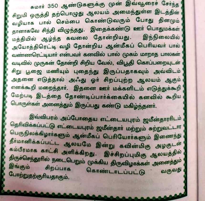 சுமார் 350 ஆண்டுகளுக்கு முன் இவ்வூரைச் சேர்ந்த சிறுமி ஒருத்தி தற்பொழுது ஆலயம் அமைந்துள்ள இடத்தின் வழியாக பால் செம்பை கொண்டுவரும் போது தினமும் தானாகவே சிந்தி விழுந்தது . இதைக்கண்டு ஊர் பொதுமக்கள் மத்தியில் ஆழ்ந்த கவலை தோன்றியது . அயோத்திரெட்டி வழி தோன்றிய ஆன்மீகப் பெரியவர் பால் வண்ணரெட்டியார் என்பவர் கனவில் பால் முகம் மாறாத பாலகன் வடிவில் முருகன் தோன்றி சிறிய வேல் , விபூதி கொப்பறையுடன் சிறு பூஜை மணியும் புதைந்து இருப்பதாகவும் அவ்விடம் அதனை எடுத்தால் அஃது ஓர் சிறப்புற்ற ஆலயம் ஆகும் எனக்கூறி மறைந்தார் . இதனை ஊர் மக்களிடம் எடுத்துக்கூறி மேற்படி இடத்தை தோண்டிப்பார்க்கையில் கனவில் கூறிய பொருள்கள் அனைத்தும் இருப்பது கண்டு...சுமார் 350 ஆண்டுகளுக்கு முன் இவ்வூரைச் சேர்ந்த சிறுமி ஒருத்தி தற்பொழுது ஆலயம் அமைந்துள்ள இடத்தின் வழியாக பால் செம்பை கொண்டுவரும் போது தினமும் தானாகவே சிந்தி விழுந்தது . இதைக்கண்டு ஊர் பொதுமக்கள் மத்தியில் ஆழ்ந்த கவலை தோன்றியது . அயோத்திரெட்டி வழி தோன்றிய ஆன்மீகப் பெரியவர் பால் வண்ணரெட்டியார் என்பவர் கனவில் பால் முகம் மாறாத பாலகன் வடிவில் முருகன் தோன்றி சிறிய வேல் , விபூதி கொப்பறையுடன் சிறு பூஜை மணியும் புதைந்து இருப்பதாகவும் அவ்விடம் அதனை எடுத்தால் அஃது ஓர் சிறப்புற்ற ஆலயம் ஆகும் எனக்கூறி மறைந்தார் . இதனை ஊர் மக்களிடம் எடுத்துக்கூறி மேற்படி இடத்தை தோண்டிப்பார்க்கையில் கனவில் கூறிய பொருள்கள் அனைத்தும் இருப்பது கண்டு மகிழ்ந்தனர் . இந்நிலையில் இவ்விபரம் அப்போதைய எட்டையபுரம் ஜமீன்தாரரிடம் தெரிவிக்கப்பட்டு எட்டையபுரம் ஜமீன்தார் மற்றும் சுற்றுவட்டார பெருநிலக்கிழார்களும் ஆன்மீகப் பெரியோர்களும் இணைந்து தீர்மானிக்கப்பட்ட ஆலயமே இன்று கவின்மிகு அழகுடன் கம்பீரமாக காட்சி அளிக்கிறது . இச்சிறப்புமிகு ஆலயத்தில் திருச்செந்தூரில் நடைபெறும் முக்கிய திருவிழாக்கள் அனைத்தும் இங்கும் சிறப்பாக கொண்டாடப்பட்டு வருவது போற்றுதற்குரியதாகும் .